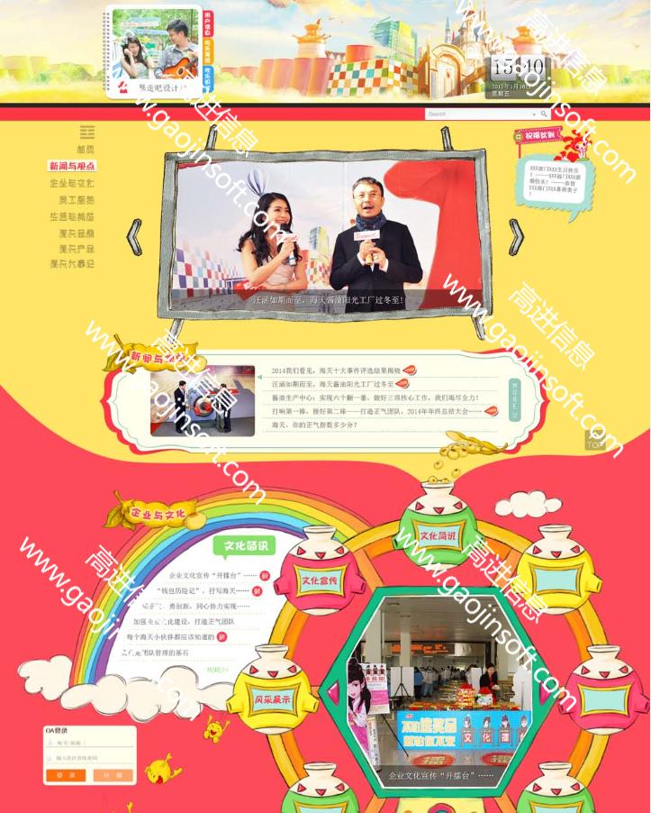 2、企業(yè)文化的宣傳平臺(tái),在此網(wǎng)站上面展示公司和內(nèi)部大小新聞,品牌知識(shí)和新聞,產(chǎn)品知識(shí)和新聞,宣傳片,企業(yè)文化精神理念宣傳、企業(yè)文化活動(dòng)剪影等內(nèi)容,向員工和合作商展示海天公司形象和活力以及積極向上的企業(yè)文化。