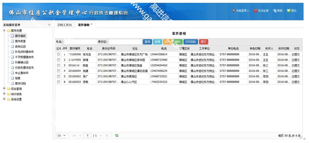 系統(tǒng)主要實(shí)現(xiàn):案件的受理,個(gè)人信息錄入,資料影像的上傳存檔,文書(shū)范本、函件的輸出,計(jì)算補(bǔ)繳的金額,提醒功能,權(quán)限的控制,統(tǒng)計(jì)報(bào)表的功能。
