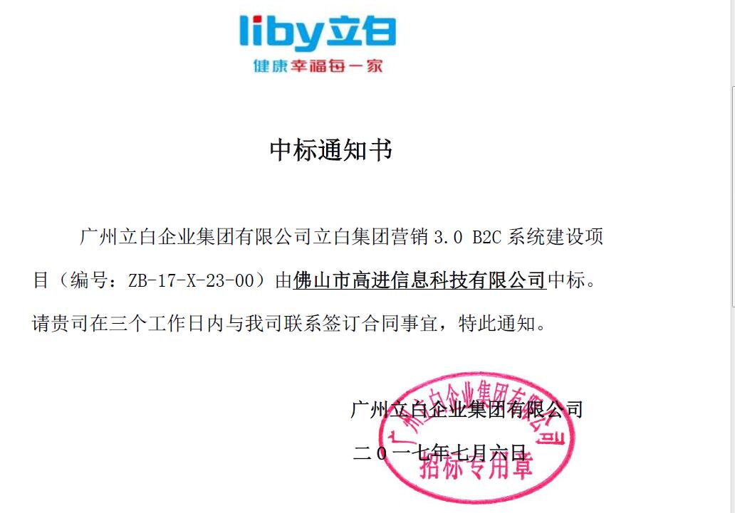 佛山市高進信息科技有限公司憑借豐富的項目管理經(jīng)驗、雄厚的技術力量和良好的企業(yè)信譽,于2017年7月6日順利中標——廣州立白集團營銷3.0 B2C系統(tǒng)建設項目。