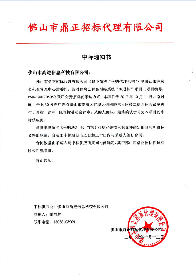 近日,我司經(jīng)過與多家實力雄厚的單位激烈競標,于2017年10月13日成功中標佛山市住房公積金管理中心住房公積金網(wǎng)絡系統(tǒng)“雙貫標”項目。過硬的資質、雄厚的技術實力、合理的價格、誠實守信的經(jīng)營方式、完善的服務體系是我們勝出的理由。