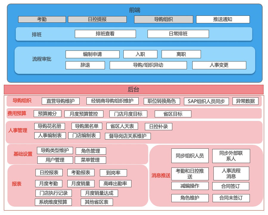 基于現(xiàn)有的導(dǎo)購(gòu)信息管理系統(tǒng)痛點(diǎn),導(dǎo)購(gòu)業(yè)需求及集團(tuán)管理要求,圍繞八大業(yè)務(wù)模塊,打造一個(gè)同時(shí)具備溝通協(xié)同和業(yè)務(wù)處理的導(dǎo)購(gòu)業(yè)務(wù)管理平臺(tái),目標(biāo)是繼續(xù)現(xiàn)實(shí)導(dǎo)購(gòu)前端業(yè)務(wù)的數(shù)字化。本次項(xiàng)目建設(shè)在原有的導(dǎo)購(gòu)項(xiàng)目的建設(shè)成果上,繼續(xù)完善前端業(yè)務(wù)的數(shù)字化能力,包括編制管理、人事管理、排班管理、流程審批及與業(yè)務(wù)系統(tǒng)的對(duì)接幾個(gè)大塊。