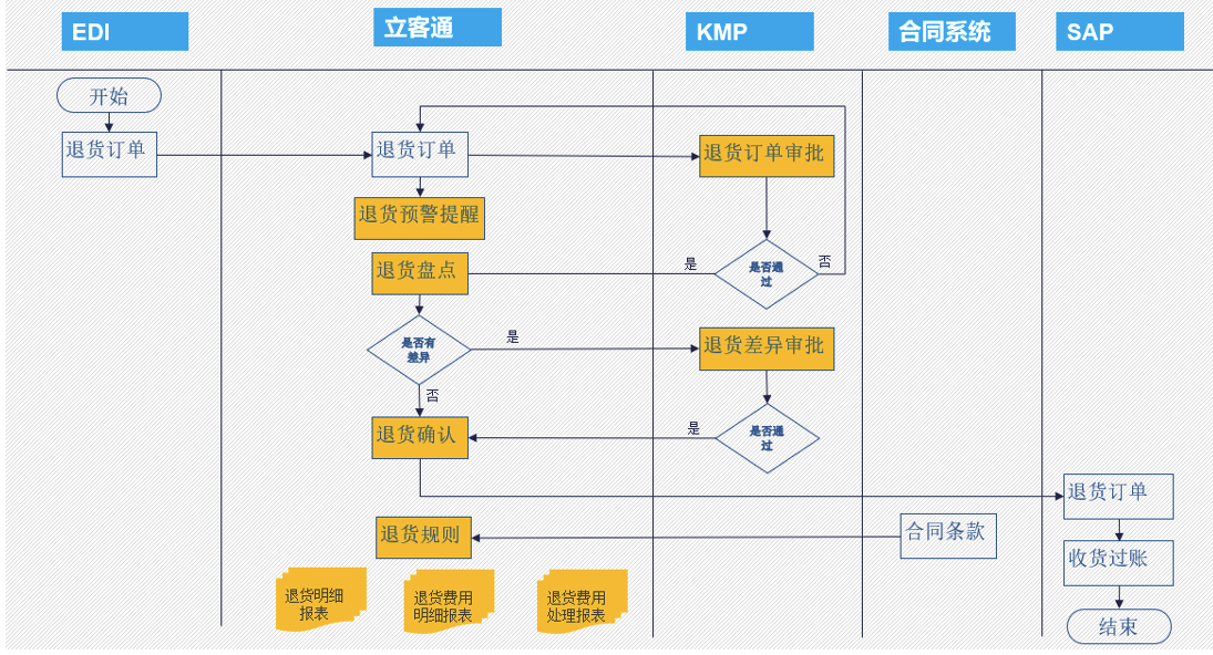 2、退貨訂單通過(guò)導(dǎo)入,并通過(guò)流程審批,對(duì)退貨訂單進(jìn)行接入或處理退貨差異,為公司減 少退貨差異的損失。