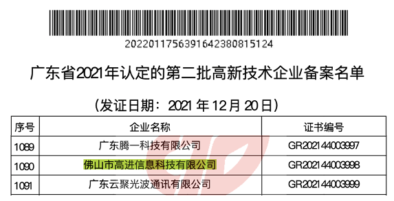 根據(jù)《高新技術(shù)企業(yè)認(rèn)定管理辦法》(國科發(fā)火〔2016〕32號)和《高新技術(shù)企業(yè)認(rèn)定管理工作指引》(國科發(fā)火〔2016〕195號)有關(guān)規(guī)定,在經(jīng)過各級審核以及專家評審之后,廣東省認(rèn)定管理機(jī)構(gòu)2021年認(rèn)定的第二批5639家高新技術(shù)企業(yè)備案,我公司順利通過。
