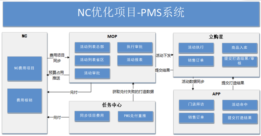 本次NC系統(tǒng)優(yōu)化項目(PMS部分)主要針對NC系統(tǒng)升級后,配套外圍系統(tǒng)的升級增強,提升系統(tǒng)原有功能,強化預算及風險管控,從而提升營銷費用管理水平,為業(yè)務(wù)賦能。